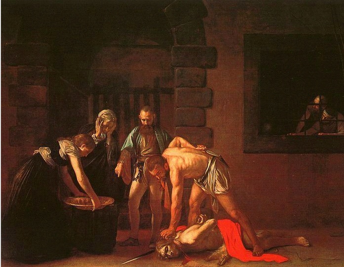 Clearly Caravaggio’s work does reflect an obsession with violence to the throat. Nothing really prepares his audience for the change around 1599. That impulse to violence would be directed outward at least in his art until the very end and his most celebrated artistic effort of all. However, Caravaggio’s art would predict a worsening of his behavior from 1599, sometimes held in check, but inexorably progressing to serious violence with substance abuse a strong contributing factor. Social and living conditions would also subsequently deteriorate. Judith does indicate a major psychotic episode that Caravaggio could barely keep in check even in the context of painting a conversion in a custom-house, and, as the comedian put it, “an accident in a Blacksmith’s shop”. The treatment of the eyes of both Matthew and Paul reflect Caravaggio’s alternating state between the socially withdrawn vacant stare of the schizophrenic and the intense and terrifying experience in the eyes described by Reich. Both are works of naturalistic genius that overthrow centuries of tradition, but that very naturalistic modesty in which their genius is said to consist may represent a holding strategy from a sick man representing, and reflecting upon, his own physical experience. The pictures of St Matthew in themselves are a case in point. The Calling can hardly be reckoned a masterpiece of narrative or technical composition – Matthew is called by a light emanating from where we know not, presumably initiated by a Christ whose gaze he does not meet. It is technically unappealing and unsuccessful in its use of perspective. The Martyrdom is the least revolutionary of Caravaggio’s major works. The figures are conventional if successful in conveying energetic panic. That conventionality might simply be due to the fact that the space to covered was twice the size of what he had done previously. The real action is confined to the two central figures and the forthcoming attack on the body. Caravaggio may simply have been psychologically unable to deal with that open space. The other three paintings reflect the claustrophobic constriction of space that Caravaggio felt in himself. And, perhaps, as Reich observed, in relation to paranoid schizophrenia, his eyes and his throat. It is no coincidence, that, at the same time, Caravaggio’s paintings become “night-like by 1600” (Hibbard, 1983: 259). The Matthew and Paul series represent Carvaggio’s own suffering rather than that of his saints. An objection might be placed that the level of violence in Caravaggio in general is in broad accord with the pictures of the day. It is also a fact that these are commissioned scenes of violence, and, common sense would dictate that a non-violent depiction of martyrdom might exceed any artist’s powers of presentation. These scenes are, in a sense, “overdetermined”. However, Caravaggio’s depiction of suffering is secular, brutally physical and not about the overcoming of fear and the embrace of death to the glory of God. Souls are not waiting to be borne to heaven by a host of angels and the community of saints. This is violence directed to discrete parts of the body. The religious and transcendent content is minimal, the very least that Caravaggio can get away with, or consciously subvert, a fact that his non-compliant patrons grasped with consummate ease. Much of the later and most extreme violence is non-commissioned in any case. Of course from now on heads will roll with monotonous regularity, with the artist representing and communicating violence to the throat on a regular basis. “More than a third of the paintings attributed to him depict scenes of violence with decapitation the clear favorite among them” (Varriano, 2006: 73). Sometimes it will be presented so very discreetly. Below is one of Caravaggio’s most famous paintings, the Beheading of St John the Baptist. The saint’s throat is already cut, the executioner now moving to decapitation. The artist signs his name in John’s blood. We would argue that this painting bears direct relation to the painting of Judith. Both make reference to one of the fundamental terrors of paranoid schizophrenia, the so-called “draining fantasy” (Karon & Rosberg, 1958). Schizophrenics make constant reference to being “emptied out” or “hollow” and the draining of bodily fluids is a continuing theme in regard to their somatic delusions. The latter’s characterization of these is rather fanciful but the projection of bodily processes, and experiencing them as foreign, is real enough. John is being drained.